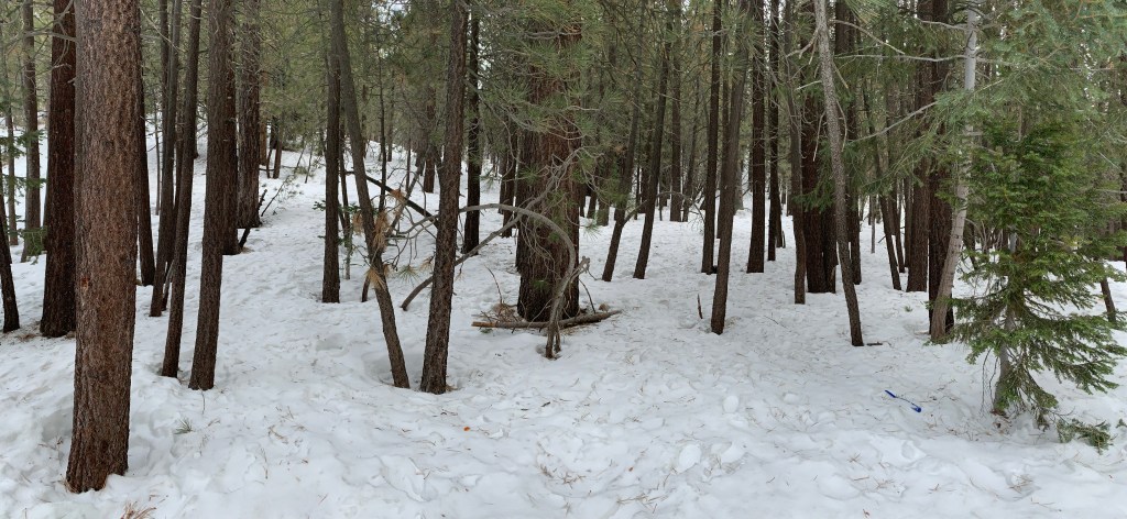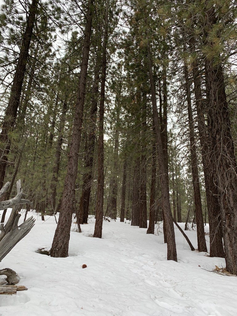 1:22pm-2:25pm Saturday February 22nd, Mt. Pinos. We quickly found open areas around the trees and the rest of the forest. My sister (the first two pictures) was extra excited about throwing snow. Since it had just snowed a bit on the way up, the snow was very soft in that specific area. Picture 3: We walked around to find a good spot with some soft snow.