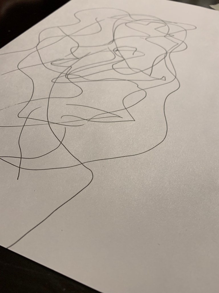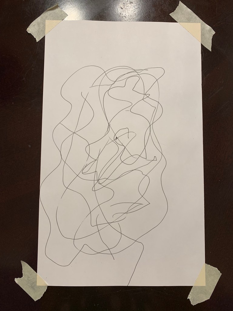 I conducted the project with the help of my mother, and we drew the piece on the kitchen table. At first it was a bit awkward because we had my younger sister making sure we did not go off the paper and draw on the table since our eyes were closed. My mom also kept asking how much longer she had to endure this task. In the end she actually liked the project and thought it was an interesting way to “draw.”