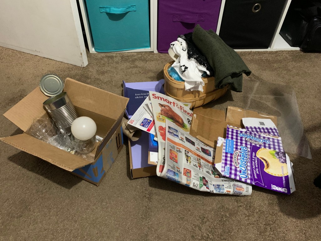 I went through the recycling bin at my house and I found a lot of cardboard that I was able to use. I also decided to use a metal food can and a glass container I found that my sister threw out. Since I could not use any paint or colored paper in the piece, I used a bunch of blue gum wrappers to add some color to one of the legs. I also used leaves from my backyard and some orange peels to add color inside the head. However, I had to use some glue, tape, and string to be able to hold the sculpture together. I did try to minimize my use of those martials by not attaching the body together, instead they are just stacked on top on one another (separated into 4 pieces).
