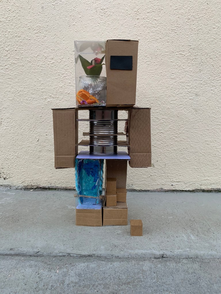 I had a general idea of what I wanted to create, so first, I had focused on finding some cardboard from old boxes or packages and from food items. Then, as I found more materials, I slowly designed the sculpture based on the materials I was able to find. overall, this project forced me to work with what I could find, rather than going out to buy things that I needed. These materials also affected my experience because I was limited with what colors I could use because I could not use paint to create the textures I wanted. However, I still enjoyed the project of making a sculpture from “found materials”