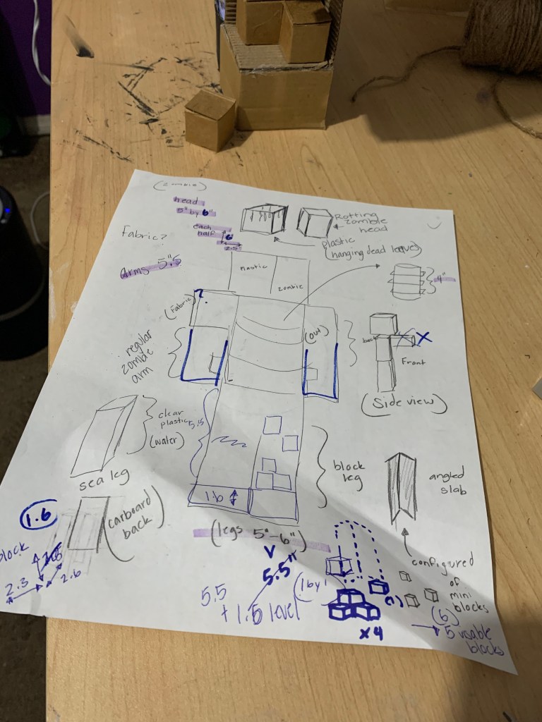 I decided to make a sculpture based off Minecraft characters because I have made one before made entirely out of cardboard. Since I enjoyed the result of the first one I made, this time I wanted to make a bigger figure and incorporate more “reused materials” instead of just using cardboard.