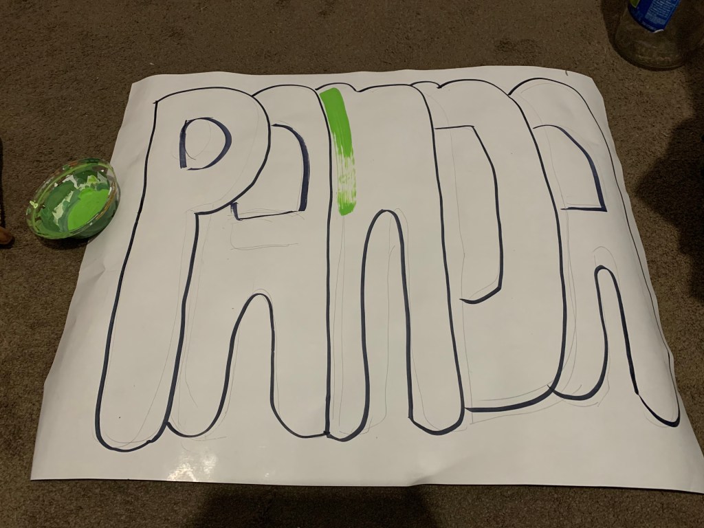 I started out by drawing out the outline in pencil, then I traced it with a black marker. Once I had my outline, I decided to paint it. My sister gave me the idea to leave the name in black and white to resemble a panda. However, I wanted to add more color so I decided to make the letter “N” in the painting resemble bamboo.